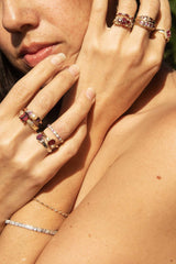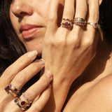 An elegant show of fire and brilliance, the 18-carat gold Khloe Ring features a crimson ruby embraced by dazzling diamonds. Her clean lines accentuate the richness of the ruby, showcasing the beauty of one of nature's most beloved gems.