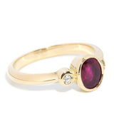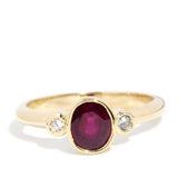 The bright red oval ruby is estimated to weigh 1.00 carat and measures approximately 6.6x5.5x3.4 millimetres. The round brilliant cut diamonds are estimated total 0.08 carats with H colour and VS clarity grades.