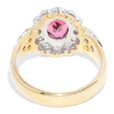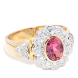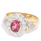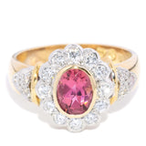 The oval slightly orangey pink tourmaline measures 7.00x5.20x3.60 millimetres and is estimated to weigh 0.80 carats. The twelve surrounding round brilliant cut diamonds are estimated to weigh 0.30 carats, are G to H colour and SI to P1 clarity grades. The six shoulders diamonds are estimated to weigh 0.06 carats.