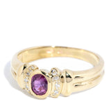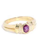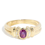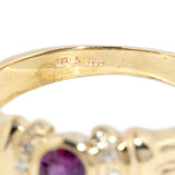 The oval purplish pink ruby is estimated to weigh 0.47 carats and is moderately included. The six single cut diamonds are estimated to weigh 0.03 carats, are F colour and VS to SI clarity grades.