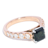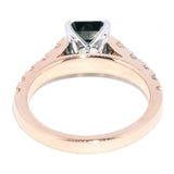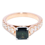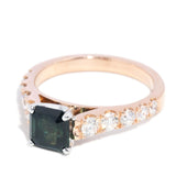 The dark green square-emerald cut sapphire measures approximately 6.59 x 6.27 x 3.80 millimetres with an estimated weight of 1.42 carat. The ten round brilliant cut diamonds graduate in size from 2.20 to 2.90 millimetres with an estimated total of 0.65 carat. They are F colour and VS2 to SI2 clarity grade.