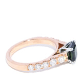 Liadan, a contemporary marvel, wields the deep glow of sapphire, cradled within 18 carat rose and white gold. Her diamonds dance like stardust in twilight, cascading down each shoulder. A true testament to poetic artistry, she promises beauty reborn and eternally cherished.