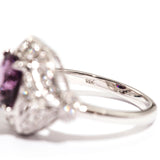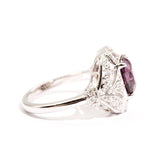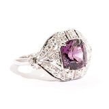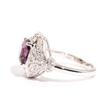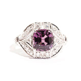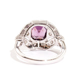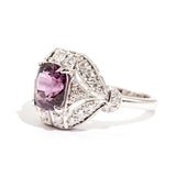 The primary gemstone is a 2.54 carat bright pinkish purple cushion cut natural spinel. The round brilliant cut diamonds total 0.45 carats and are of G colour and SI Clarity grades.