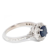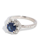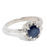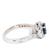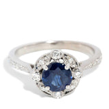 The deep blue round sapphire measures 5.90x6.00 millimetres. The thirty-six round brilliant cut diamonds are estimated to weigh 0.26 carats, are G colour and SI to P1 clarity grades.