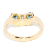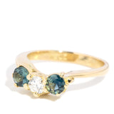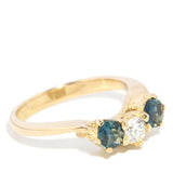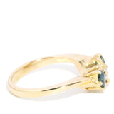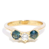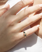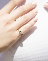 The 18 carat yellow gold Elara Ring is a celestial beauty, her deep teal sapphires embracing a luminous diamond. A perfect harmony of light and depth, she is a striking tribute to elegance.