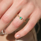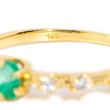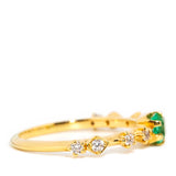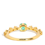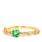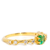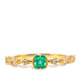 Crafted in 18 carat yellow gold, this delightful contemporary ring holds an alluring natural green emerald flanked by eight glistening round brilliant cut diamonds shimmering in unison. Her name is The Ruri Ring, the perfect ring for stacking with other beloved gems and jewels or wearing alone.