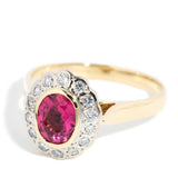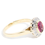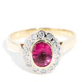 Radiating feminine charm, our Shea Pink Tourmaline Diamond Halo Ring is a sweet treasure. Her vibrant oval pink tourmaline, reminiscent of blossoms in bloom, sits at her centre, encircled by a dazzling halo of brilliant-cut diamonds. The high-polish glow of 18 carat gold enhances the gemstones' brilliance. Shea is a celebration of vibrant color and delicate sparkle, a perfect gift for someone special.