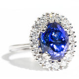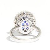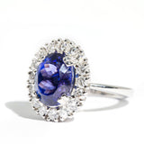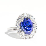 The flawless 6.47 carat faceted oval Tanzanite measures approximately 12.0x9.4x7.5 millimetres and is a bright vivid purplish blue colour. The diamonds total 1.51 carats and are F to H colour and VS to SI clarity grades.