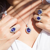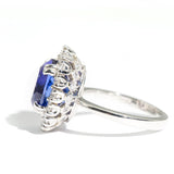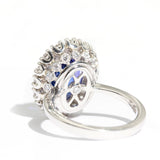A radiant embrace of platinum cradles an exquisite tanzanite, its violet hues shimmering like twilight rekindled. Surrounded by a halo of sparkling diamonds, this ring captures the heart’s whimsy. With every glance, bask in the enchanting dance of light, evoking emotions of love and elegance that whisper stories only you can tell.