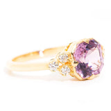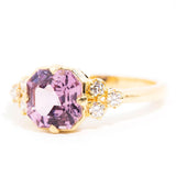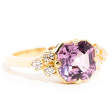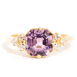 The Asscher cut spinel is 2.28 carats, measures 7.56x7.51x4.81 millimetres, and is a bright light pinkish purple colour. The round brilliant cut diamonds total 0.21 carats, are F to G colour and VS to SI clarity grades.