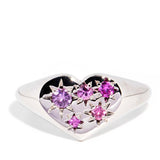 The round faceted natural sapphires are shades of pastel pinks and purples, and the five gems total 0.20 carats.