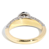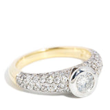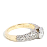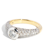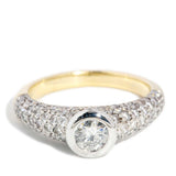 A half band of sparkling pave set diamonds meet to raise a stunning bezel set diamond suffused in light. Handsomely crafted in 18 carat white and yellow gold she is our Poppy Ring, a statement of your intent and a promise of a lifetime lived in love.