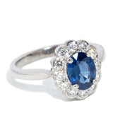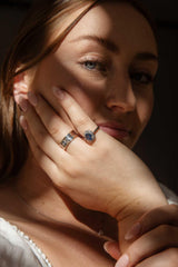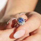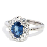 With her royal blue sapphire and a frame of sparkling diamond petals our Delaney Ring is an exquisite jewel. Lovingly crafted in 18 carat white gold she will be a wonderful addition to your family for generations to come.