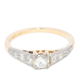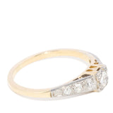 The centre transition cut diamond is estimated to weigh 0.12 carats, is J colour and SI clarity grade. The six side single, rose and brilliant cut diamonds are estimated to weigh 0.04 carats.