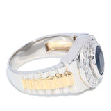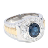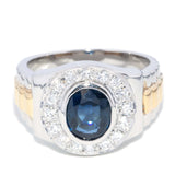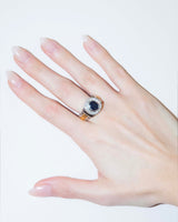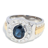 Amid a world of swirling memories, Filip emerges, a stunning 18ct gold sapphire & diamond halo ring, showcasing vintage 1990s allure. Her deep blue sapphire, embraced by a diamond halo, beguiles the eye, while stepped two-tone shoulders add a graceful touch.