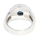 An oval, slightly greenish deep blue sapphire measures 9.00x7.50x4.00 millimetres and is estimated to weigh 2.38 carats. The sixteen round brilliant cut diamonds are estimated to weigh 0.48 carats, are G to H colour and SI to P1 clarity grades.