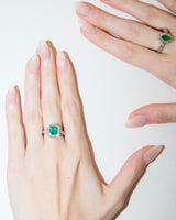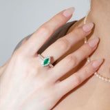 In her marquise embrace, Sierra captures the vintage grace of emerald dreams, cradled by a halo of sparkling diamond whispers, her 18 carat white gold body cradling stories untold, gently brushed by time's tender touch, radiating a captivating, nostalgic allure.