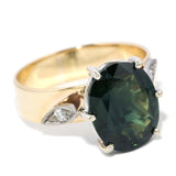 The dark green oval sapphire measures approximately 11.96 x 9.29 x 4.77 millimetres with an estimated weight of 4.30 carats. The two round brilliant cut diamonds are estimated to total 0.06 carat with a G to H colour and VS2 to SI1 clarity grade.