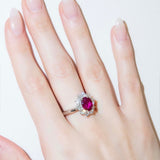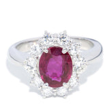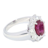 Maya 1990s Pinkish Red Ruby & Diamond Platinum Halo Ring