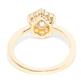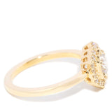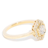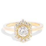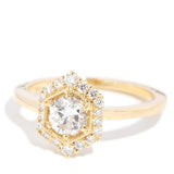 The darling 18 carat yellow gold Quinn Ring holds a shimmering central round diamond set within a hexagonal border of grain set diamonds.