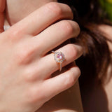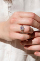 Forged in gleaming 18 carat gold, this stunning contemporary ring sees an enchanting halo cluster with a light pink sapphire set carefully within a shimmering border of round brilliant cut diamonds and with diamonds running down the elegant shoulders. Her name is The Callista Ring, a gorgeous statement of cherished love for ages to come.