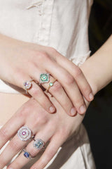 The Callista Ring belongs to our Freedom Collection. Each piece in the Freedom Collection is slow fashion at its finest. Uniquely designed and crafted with at least 90% reclaimed gems, diamonds, gold & platinum. Diamonds, gemstones and precious metals can last many lifetimes, an eternity in fact, unlike some jewellery designs. The freedom collection is ethical fashion, hand-crafted from previously loved jewellery. Know that your stunning jewellery makes the lightest of footprints on our earth.