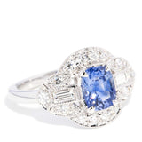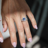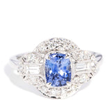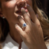 The 18 carat white gold Amina Ring is a masterpiece of elegance, featuring a cushion-cut Ceylon blue sapphire with an ethereal glow. Encased in a radiant halo of brilliant and baguette diamonds, this timeless treasure exudes grace and sophistication. She is a symbol of unwavering love and serene beauty.