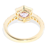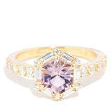 The darling 18 carat yellow gold Glinda Ring holds a central hexagonal pink spinel with a border of white diamonds and diamonds cascading down the shoulders.