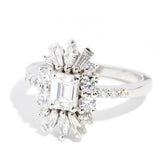 The elegant 18 carat white gold Muriel Ring holds a central emerald-cut diamond framed with an array of baguette, marquise, and brilliant-cut diamonds radiating outward a starburst design. The slender band is adorned with additional diamonds.