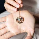 A whimsical reminder of a time long past, the darling Sarah Brooch is a 15 carat rose gold disc with an asymmetrical open pattern and a solid Australian black opal at the centre with a single seed pearl to one side. Fitted with a 50mm safety chain and pin.