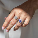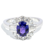 The 18 carat white gold Airlie Ring is a statement of elegance, featuring a rich oval-cut purple sapphire that glows with depth and mystery. A halo of brilliant and baguette diamonds frames the centrepiece, adding contrast and brilliance. This exquisite piece captures the enchantment of twilight and the romance of enduring love.