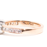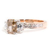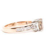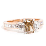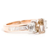 Forged in 18 carat rose and white gold, this gorgeous contemporary ring features a certified 1.36 carat radiant cut cognac diamond flanked by two sparkling emerald cut diamonds and finished with two rows of princess cut diamonds down each shoulder. We have named this wondrous ring The Danyel Ring. The Danyel Ring has been designed to last the ages with her modern design. She will make a marvellous engagement ring or a perfectly fitting piece to mark a meaningful life event.
