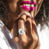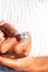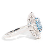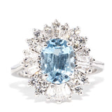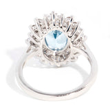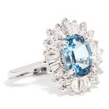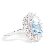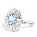 Crafted with devotion in 18 carat white gold, this stunning contemporary ballerina halo cluster ring features an enchanting 2.01-carat oval bright blue aquamarine encompassed by 1.06 carats of glistening round brilliant and baguette cut diamonds. We have named her The Stella Ring, and she is ever-so wonderous. Her seductive light blue tones make one stop for breath. She could be a gorgeous engagement ring, a statement of love and devotion to mark a momentous occasion.
