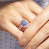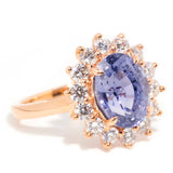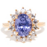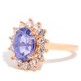 The Ceylon sapphire is 3.86 carats and is a bright purplish blue colour. The round brilliant cut diamonds total 0.91 carats and are F to G colour and SI clarity grades.