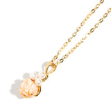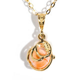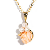 Crafted with love in 9 carat yellow gold, this truly wonderful pendant is home to a whimsical orange coral rose with a charming trio of white cultured pearls. She rests in a lovely wire frame cradle setting and articulates from a graceful bail threaded with a fine chain. Her name is The Carina Pendant & Chain. She is a perfect symbol of delicate love that is as perfect as the one who wears her and a truly amazing find!