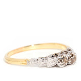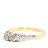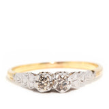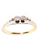 Crafted in 18 carat yellow and white gold, this lovely vintage 1950s ring features a lovely duo of transition cut diamonds set atop elegant stepped shoulders. We have named this whimsical piece The Stephie Ring. She is a wonderful choice for everyday wear, evoking strong feelings of love and devotion.
