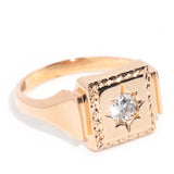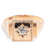 Forged in 9 carat rose gold, this nostalgic men's signet ring features a shimmering Old Cut diamond star set into the centre of a high polish square setting with a patterned border. We have named this sophisticated ring The Kiran Ring. Finished with a high polish band, this debonair ring is perfect for everyday.