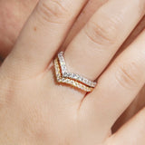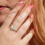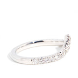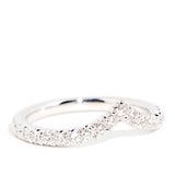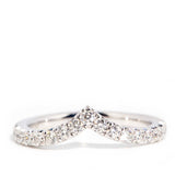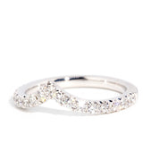 Crafted in 18 carat white gold, this light contemporary ring features a chevron setting set with nineteen glistening round brilliant diamonds. The Rhada Ring makes a seamless transition from day to night and looks wonderful alone or stacked with other beloved gems and jewels.