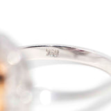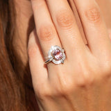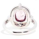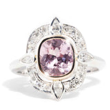 The cushion cut bright dusty pink colour Spinel is 2.13 carats. The four marquise brilliant cut diamonds total 0.15 carats and are F colour and VS clarity grades. The round brilliant cut diamonds total 0.16 carats and are F colour and VS clarity grades.