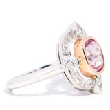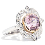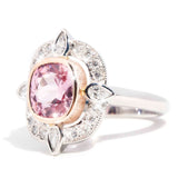 Lovingly handcrafted in shimmering 18 carat white and rose gold, this wonderful contemporary cluster ring is a masterwork of elegant design. The gleaming tapered white gold band holds a gorgeous gallery with an adorable cushion cut pink spinel gleaming in a rose gold bezel setting. The spinel is complemented on each side by a glittering rub over marquise cut diamond, while a glistening border of bead set round brilliant cut diamonds provide an opulent finishing touch. The Peony Ring is a perfect balance of excitement and elegance. She would be a spectacular engagement ring or a captivating "just because" ring, one to be worn and treasured forevermore.