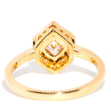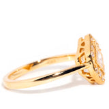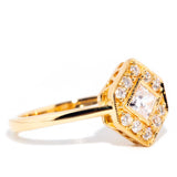 Thoughtfully crafted in 18 carat yellow gold, this endearing contemporary halo cluster ring features a delightful 0.30 carat round brilliant cut diamond encompassed by a millgrain border and a hexagonal halo of bead set round brilliant cut diamonds. We have named this wonder The Jada Ring, a symbol of love and romance, a beauty for all occasions.