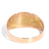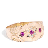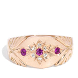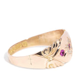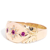 A Late Victorian beauty, the 9 carat rose gold Louise Ring is a vision of timeless elegance. Her alluring centre ruby is accentuated by shimmering diamonds. Two smaller rubies join her, radiating the warmth of a summer sunset. Her shoulders adorned with scrollwork, make her a treasure to be cherished, a whisper of romance from a century past.