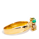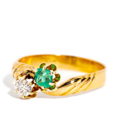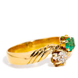 Crafted in 18 carat gold, The Arlene Ring is a vintage joy. Her vivid green emerald and sparkling diamond are cradled in flower baskets raised above a golden band that twists and ribbons around them. A perfect addition to any collection that symbolizes intertwined lives and loves.
