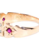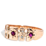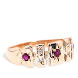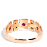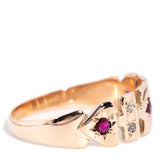 Sweetly crafted in 9 carat gold, The Gloria Ring is a lovely vintage memory. Her cut out belt design, embellished with crimson rubies and shimmering diamonds, is a celebration of another time and invites you to visit.