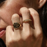 The Leonard Ring is part of our trove of strongly sustainable, environmentally friendly, and conflict-free jewellery. She lives in our carefully curated collection of one-of-a-kind vintage treasures - polished and restored with care by our talented jewellers, restoring them to their former glory.
