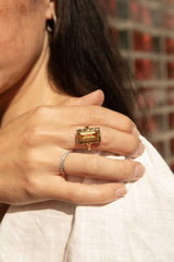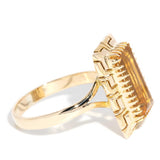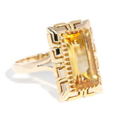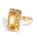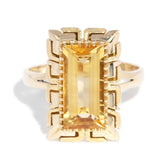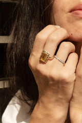 A sunlit gem, our Astoria Ring is a radiant jewel, a sunbeam captured in gold. Her elongated citrine, a vibrant splash of golden amber, is cradled in a geometric frame of 14 carat yellow gold. A design, reminiscent of ancient Greek motifs, is a celebration of nature's beauty and human craftsmanship.