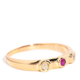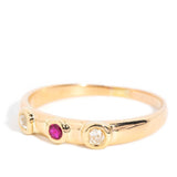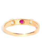 The two old cut diamonds are estimated to total 0.11 carats with I to J colour and SI clarity grades. The bright vivid purplish red ruby measures approximately 2.4 millimetres.
