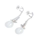 The two drop shaped South Sea pearls each measure 13.30 millimetres long and 11.30 millimetres in diameter. They are white with bright lustre and very few blemishes. The twenty round brilliant cut diamonds are estimated to weigh 0.58 carats, are G to H colour and SI1 to SI2 clarity grades.