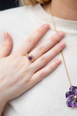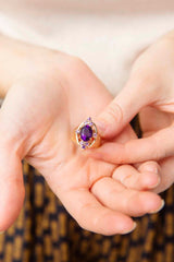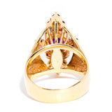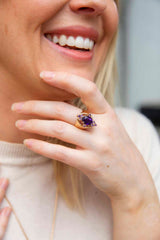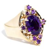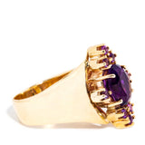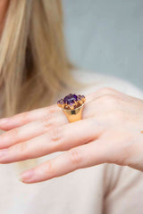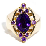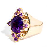 Lovingly crafted in 9 carat gold, The Cordelia Ring is a stunning vintage jewel. Her flared band rises to a marquise-shaped top crowned with vivid amethysts that move and dance in the twinkling of evening lights, evoking memories of a balmy midnight rendezvous.