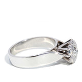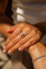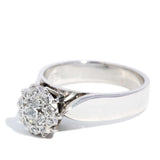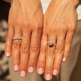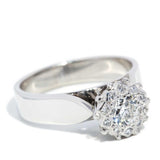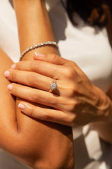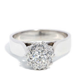 A dazzling diamond, surrounded by a halo of shimmering stones, our Carly Ring is a masterpiece of exquisite craftsmanship. Set in 18 carat white gold, her central gem, a brilliant star of light, is encircled by a constellation of smaller diamonds, creating a piece that is both radiant and refined.